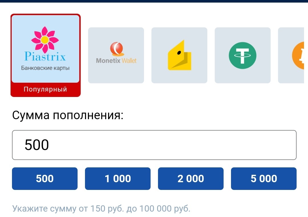 - 6. Для депозита на сайте, необходимо выбрать в Кассе способ пополнения через Piastrix. Выбрать необходимую сумму депозита и нажать "Продолжить".